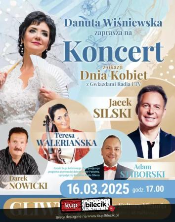 Dzień Kobiet z Gwiazdami Radia i TV, to barwny, niepowtarzalny koncert przepełniony pięknymi strojami, znanymi Państwu utworami z radia i telewizji, a przede wszystkim wspaniałą atmosferą i dużą porcją humoru! Czeka na Państwa najbardziej lubiana przez Publiczność śląska i niemiecka muzyka szlagierowa, prezentowana przez dobrze znanych naszej Publiczności Wykonawców: Danutę Wiśniewską, która zaprezentuje Państwu również utwory ze swojej nowowydanej 2.płyty solowej "Nasza Moc" oraz Jacek Silski, którego utwory nieustannie goszczą na antenach regionalnych rozgłośni radiowych, telewizji regionalnych i telewizji TVS. Wiele piosenek odniosło duże sukcesy w radiowych listach przebojów jak np. uwielbiane przez Państwa" List z morza", "Cicha noc," "Aniele" i wiele innych, które usłyszymy tego wieczoru.